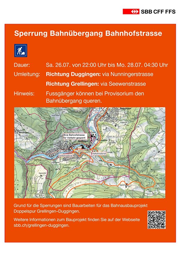 Aufgrund von Bauarbeiten im Rahmen des Bahnausbauprojekts Doppelspur Grellingen–Duggingen wird der Bahnübergang Bahnhofstrasse von Samstag, 26. Juli 2025, 22:00 Uhr, bis Montag, 28. Juli 2025, 04:30 Uhr gesperrt.